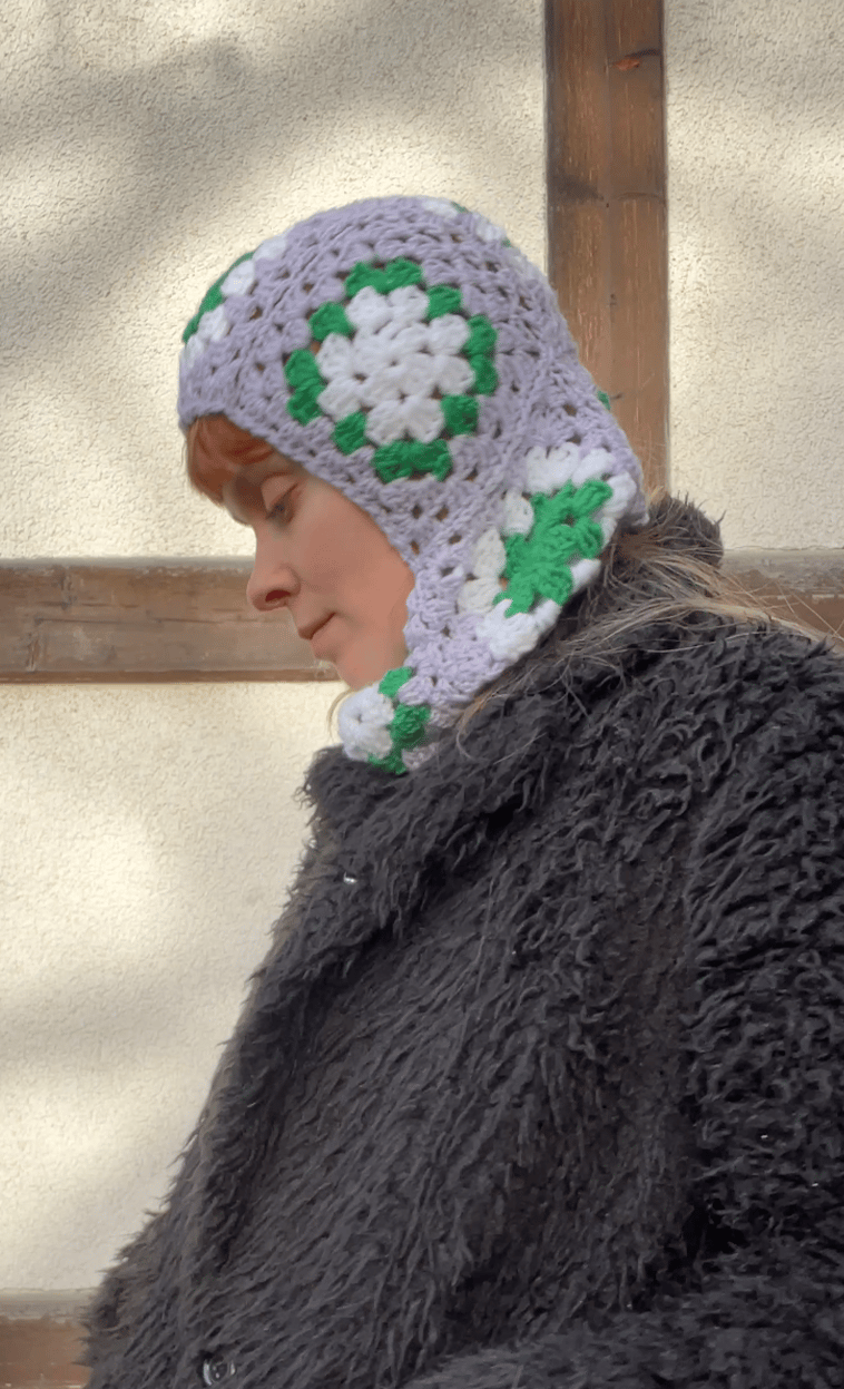 It's stretchy and can be worn like a hood. Due to granny square stitch there's holes in the design, this bonnet is suitable for milder temperatures